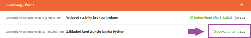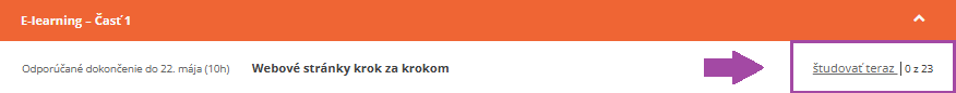 1. Začneš štúdiom prvej e-learningovej časti kliknutím na odkaz „študovať teraz“.