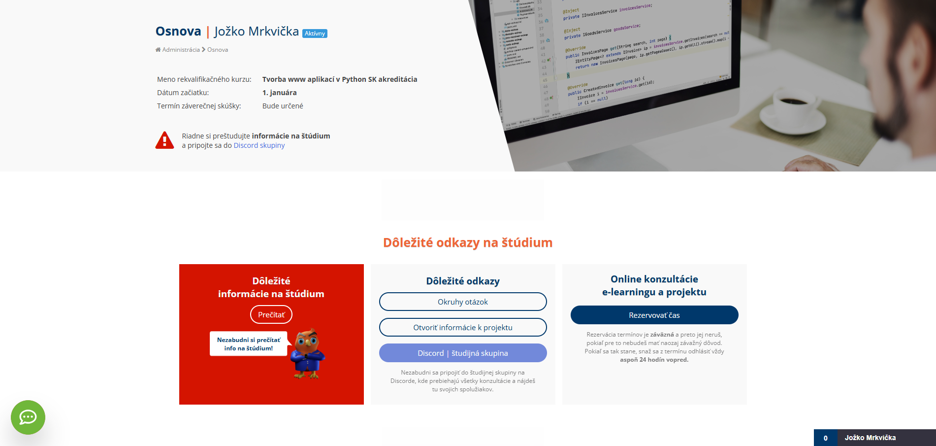Konzultácie Ak sa v priebehu štúdia na niečom zasekneš alebo potrebuješ poradiť s projektom, využi možnosť pravidelnej konzultácie s koučom. Ušetrí ti to čas aj nervy. Tie potom prebiehajú online práve cez platformu Discord.