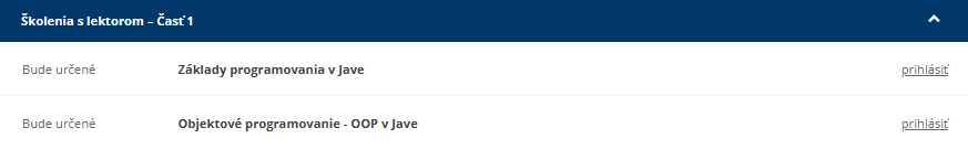 Kurz je rozdelený na 2 časti. Pre prístupy do druhej časti je najskôr potrebné úspešne dokončiť prvé 3 e-learningové moduly (statický web, Základy programovania a Objektovo-orientované programovanie), a to vrátane záverečných testov. Až budeš mať hotovo, **ozvi sa svojmu študijnému referentovi pre odomknutie nadväzujúcu časť kurzu. Jednotlivé časti sú od seba graficky oddelené, čiže nebudeš mať problém ich od seba rozoznať.