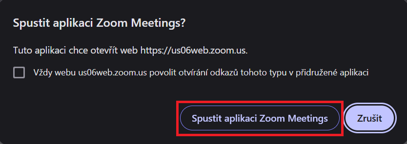B. Po kliknutí na odkaz sa ti otvorí nová stránka v prehliadači s otázkou, či chceš spustiť aplikáciu Zoom – zvoľ možnosť „Spustiť aplikáciu Zoom Meetings“.