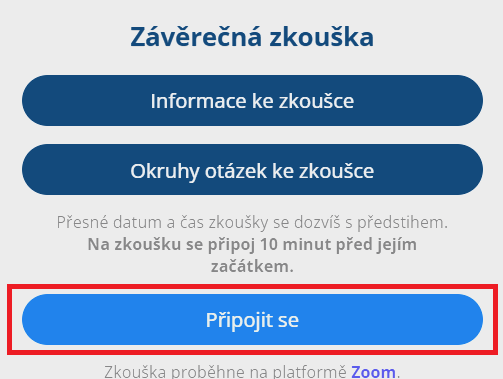 Ako už bolo spomenuté, skúška prebieha na platforme Zoom. Odporúčame si včas stiahnuť si ich aplikáciu a vyskúšať si meeting ešte pred samotnou skúškou.