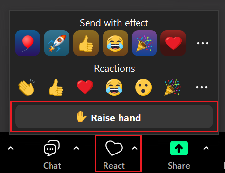 Aby sme nehovorili jeden cez druhého prihlás sa o slovo kliknutím na tlačidlo "srdce" a následne "Raise hand". Zároveň tu môžeš pomocou emoji vyjadriť svoje dojmy zo skúšky.