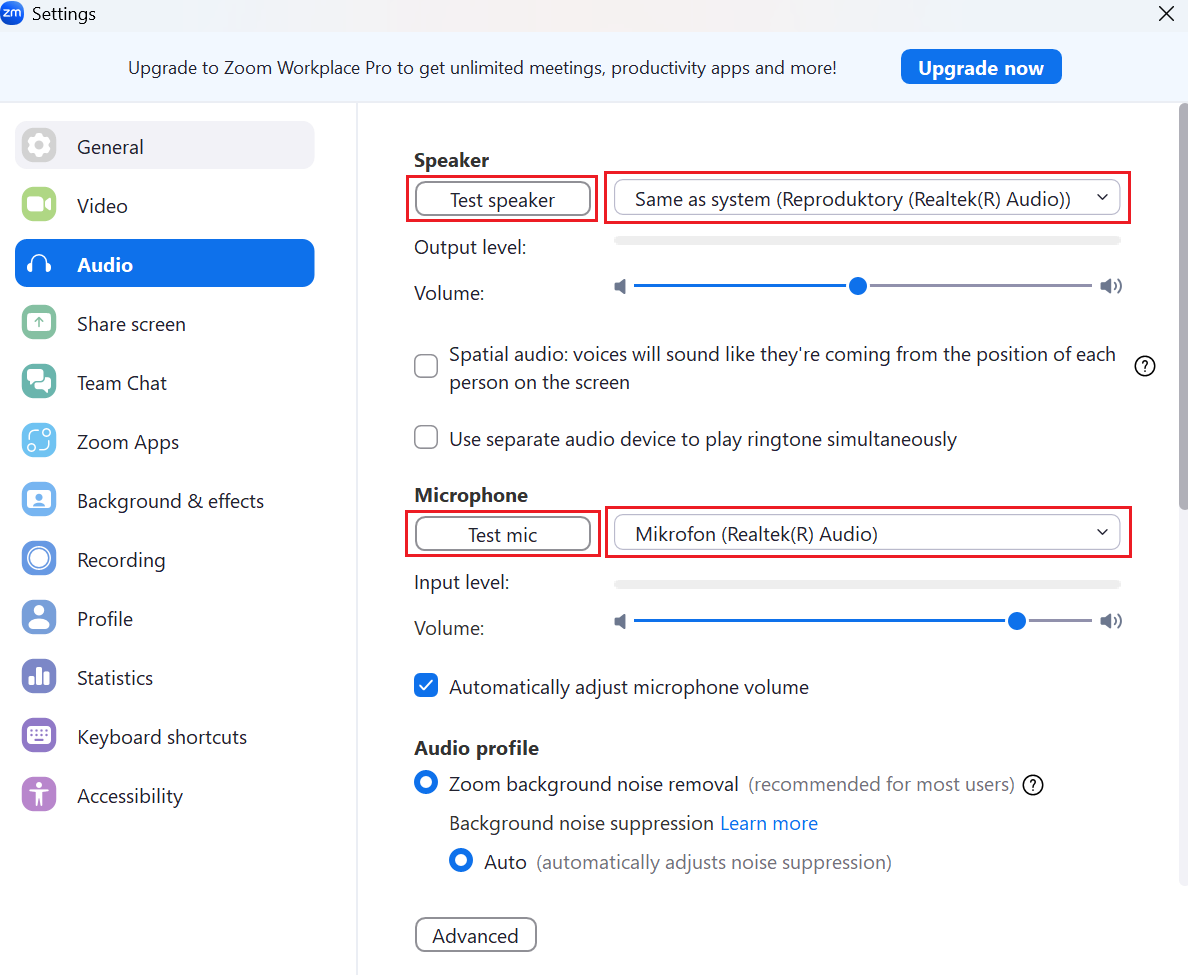 Tu si môžeš pomocou tlačidiel "Test speaker" a "Test mic" vyskúšať, či ti správne funguje zvuk pri vstupnom aj výstupnom zvuku. Ak zvuk nefunguje vyber pomocou rolovacej lišty iný zdroj. Akonáhle máš nastavené, môže toto okno zavrieť.