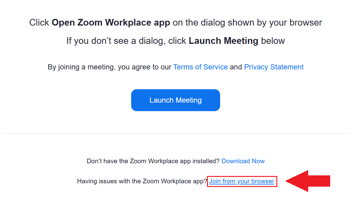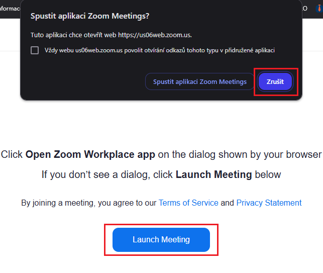 Odkaz na skúšky skopíruj do prehliadača. Pravdepodobne na teba vyskočí ponuka na otvorenie aplikácie Zoom. Klikni na tlačidlo "Zrušiť" a následne "Launch Meeting". Znovu sa ti objaví otázka na spustenie aplikácie Zoom, ale zároveň sa ti tu objaví "Join from your browser", na ktorú klikni.