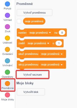 Aby sme vytvorili zoznam, prejdeme do blokov Premenné a klikneme na tlačidlo Vytvor zoznam: