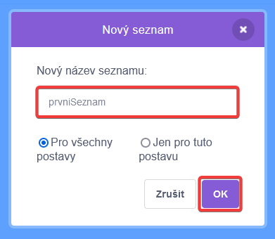 Zobrazí sa rovnaký dialóg, ako keď vytvárame premennú. Zadáme názov zoznamu a okno potvrdíme: