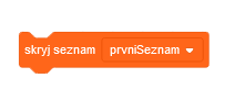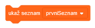 Ak chceme zobraziť všetky prvky v zozname, môžeme to urobiť zaškrtnutím fajky pri názve zoznamu (tak ako pri premennej). V aplikácii potom pre zobrazenie zoznamu použijeme blok ukáž zoznam: