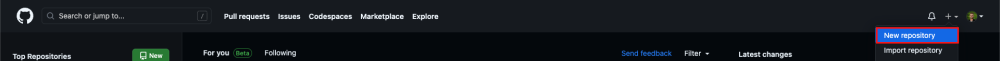 Ako prvé vytvor pre projekt nový repozitár, ktorý s nami budeš zdieľať. Zaregistruj si nový účet na github.com alebo sa prihlás do existujúceho účtu, ak ho už máš. V pravom hornom rohu klikneš na tlačidlo + a z rozbaľovacej ponuky vyberieš New repository: