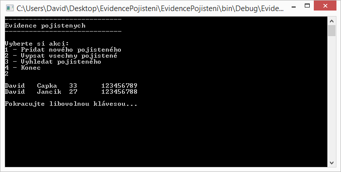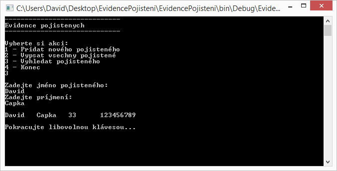 while volba != "4": print("\nVyberte si akciu:") print("1 - Pridať nového poisteného") print("2 - Vypísať všetkých poistených") print("3 - Vyhľadať poisteného podľa mena a priezviska") print("4 - Koniec") ...