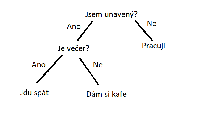 Na ukážkovom stromu vidíme v koreni otázku, ktorá rozdeľuje zvyšok stromu do dvoch základných kategórií - na činnosti, ktoré budeme robiť, ak sme unavení, a na tie, ktoré budeme robiť, ak unavení nie sme. V uzloch sú potom ďalšie otázky alebo ich odpovede (ktoré sú listy).