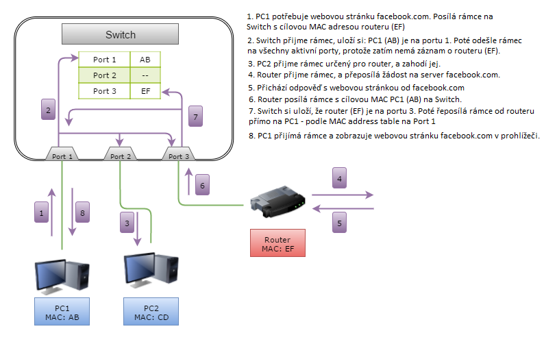O niekoľko milisekúnd neskôr príde na router odpoveď od servera facebook.com s webovou stránkou. Router vie, že o túto stránku si požiadal PC 1. Pošle ďalej teda rámec s webovou stránkou na switch. A proces učenia sa opakuje - switch sa pozrie do zdrojovej MAC v rámci, a naučia sa, že router je na porte 3. A pretože už vie, že PC 1 je pripojený na porte 1, nemusí rámec posielať všetkým, ale prepošle ho iba na port 1.