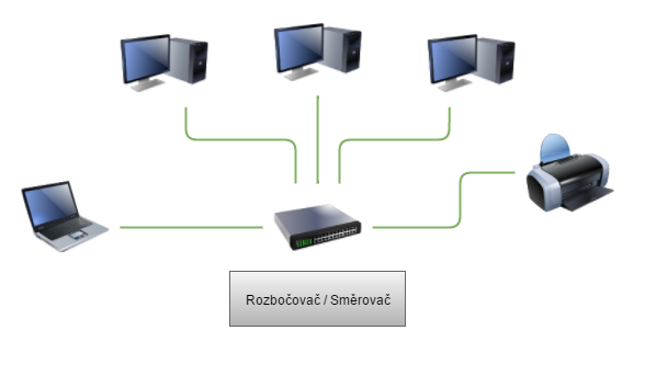 Samozrejme nemôžeme prepojiť každý PC s každým, pretože sieťové karty majú len jeden port, a aj keby to šlo, predstavte si, že máte 20 zariadenia - to robí dohromady 190 káblov! Riešením sú zariadenie zvané rozbočovača (hub) alebo prepínač (switch):