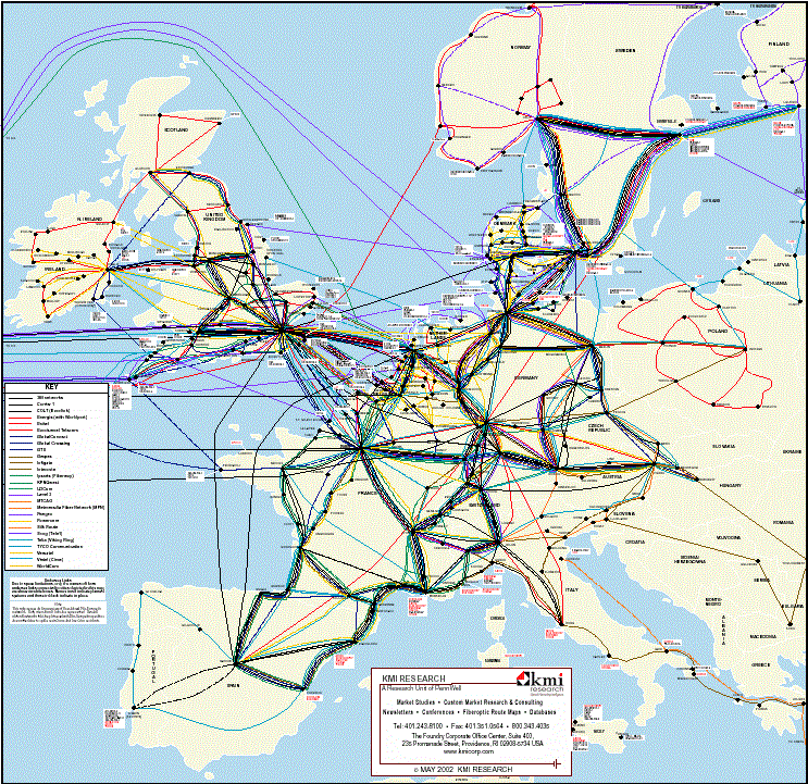 Je vidieť, ako sa káble zbiehajú vo veľkých mestách, kde sú rozvodne. Od Británia potom vedie pás optických podmorských káblov stredom Atlantiku k pobrežiu USA.