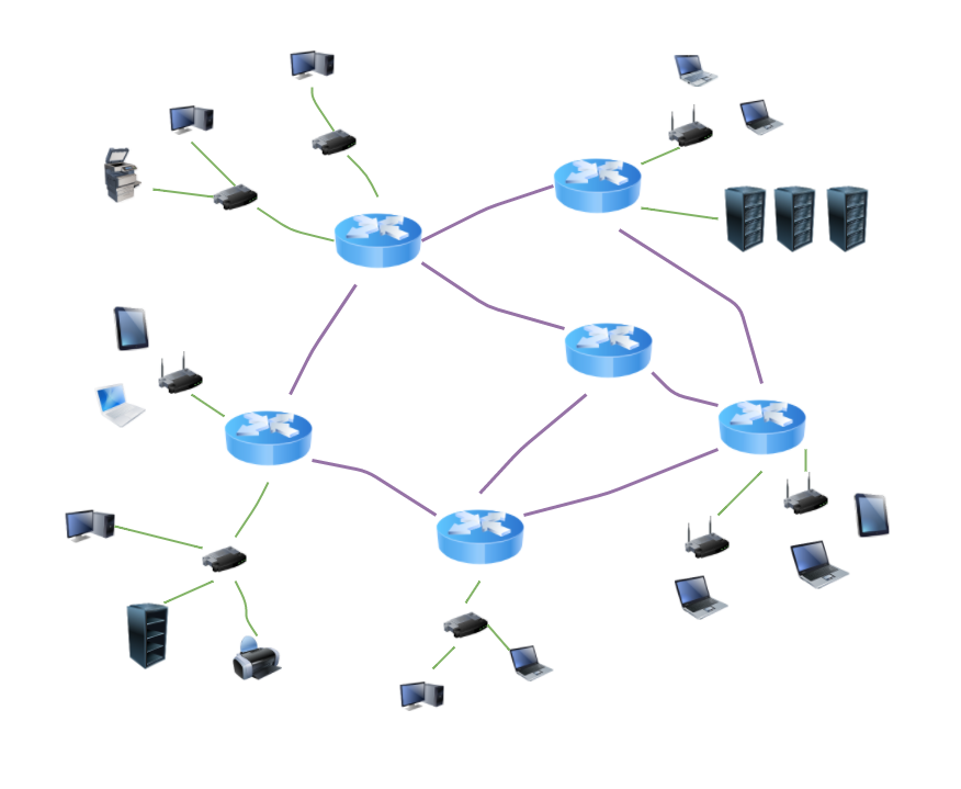 Internet sa v podstate skladá len z dvoch hlavných komponentov: router a spojenia (káblov). Úlohou routerov je dopraviť dáta, ktoré dostane, na správne cieľové zariadenie (PC, server, iný router). Schematický obrázok Internetu môže vyzerať napríklad takto (tie modré veci, to je všeobecná značka routeru):
