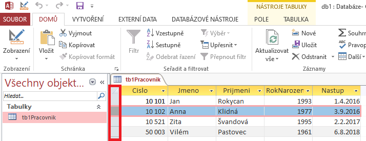 - Volič záznamov - v zobrazení tabuľky vo forme dátového listu prvej ľavý, šedý stĺpec v tabuľke, delený podľa jednotlivých riadkov. Kliknutím naň myšou sa označí konkrétne záznam ako vybraný. Na obrázku je vybraný druhý záznam.