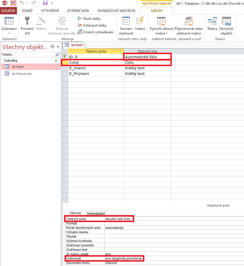 Do tabuľky tb1Deti vložíme asi päť záznamov tak, aby sa