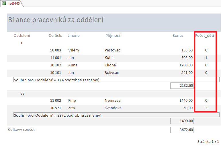 Výstupy k prezentácii z databázy sa vytvára vo veľkej väčšine s cieľom dáta nielen prehľadne usporiadať, ale vytvárať súčty a iné typy štatistík podľa rôznych kritérií. Ak potrebujeme súčty už v podrobnostiach, je potreba dáta súčtový v zdroji údajov pre zostavu, v tomto prípade dotazom. Ilustrujúci príklad z našej úlohy by bola tlač počtu detí u každého pracovníka, ktorý som vytvoril v dotaze, viď nižšie:
