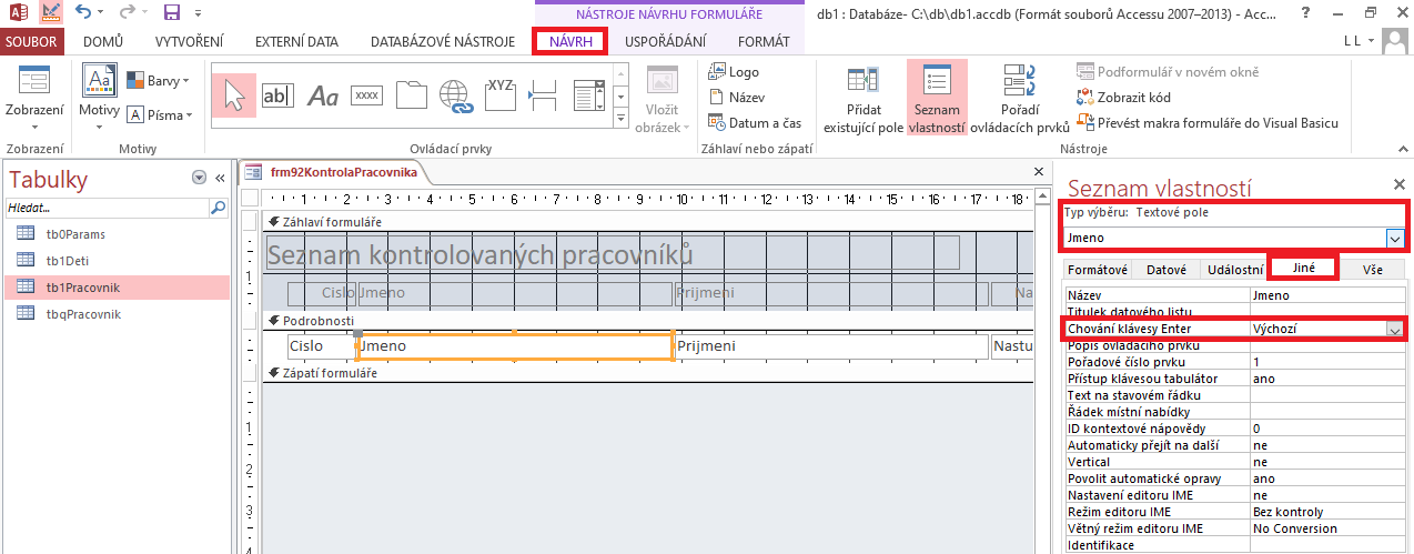 Automaticky vytvorený ovládací prvok Textové pole, ktorý zobrazuje dátový typ Krátky text, má tú necnosti, že sa po zadaní klávesy Enter odřádkuje a zostáva vo vnútri poľa. Tým sa chová nepríjemne a úplne inak, než ostatné ovládacie prvky.