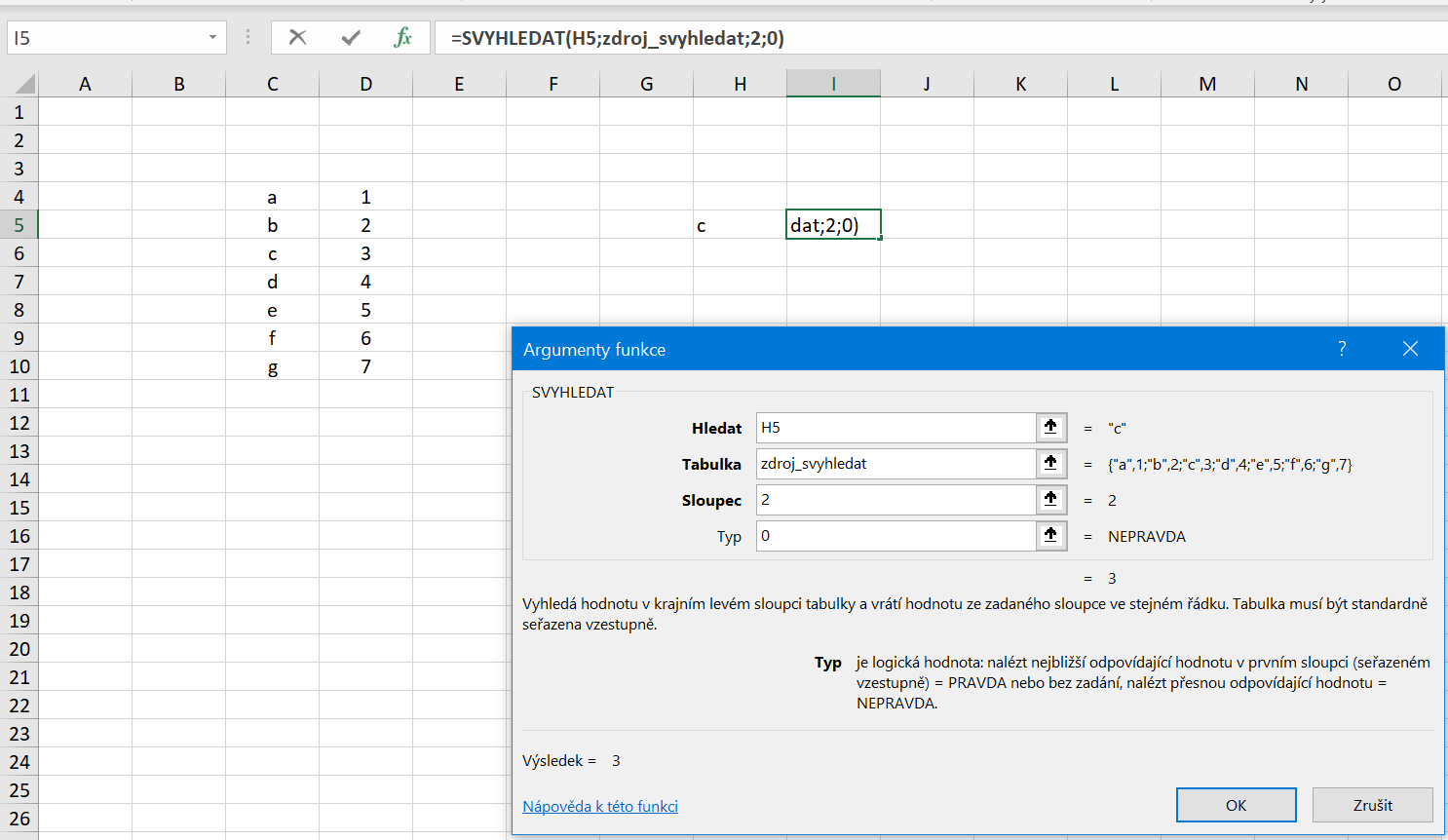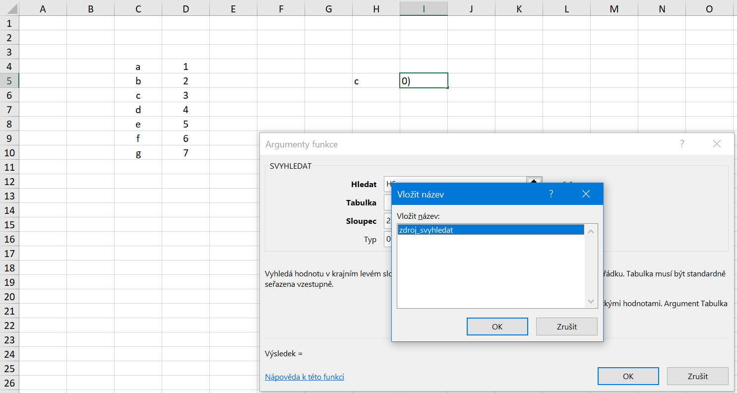 Vo fáze identifikácie zdroja, u tejto funkcie je to druhý riadok - Tabuľka - zadáme náš slovný názov namiesto toho, aby sme myšou na liste označovali nejaké bunky. Ak máme pomenovaných oblastí viac, zavoláme si pomoc klávesom F3, ktorá zobrazí malú tabuľku so všetkými pomenovanými oblasťami a my následne myšou vyberieme tú, o ktorú nám ide.