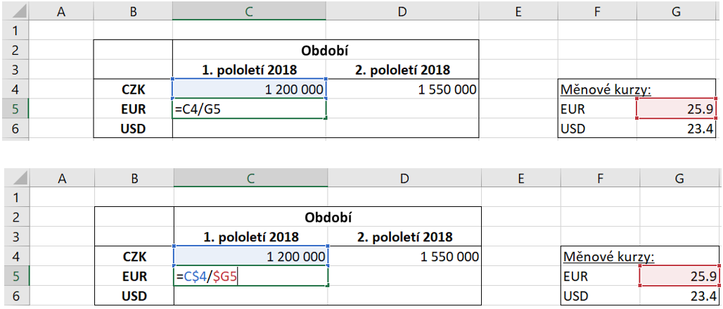 Pointa relatívneho adresovania je, že adresujeme (fixujeme, dolárom) buď len riadok, alebo len stĺpec, pričom to druhé nechávame nedotknuté.