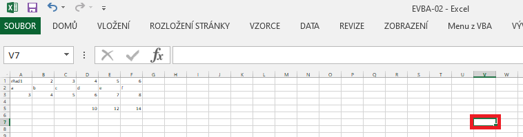 'příklad adresování mimo oblast prvního Range Set vRng = Range("D7:K26") Debug.Print vRng.Range("A1").Address 'vypíše $D$7, tedy levý horní roh vRng 'pokud je adresa v podřízeném Range mimo rozsah vyššího objektu Range, je platná a posunutá Debug.Print vRng.Range("S1").Address 'vypíše $V$7=buňku z listu posunutou o vRng, tedy D7 vRng.Range("S1").Select