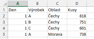 Témou dnešnej práce bude vytvorenie kontingenčnej tabuľky nad dátami evidencie predaja. Scenár je vytvorený z dát predaja troch výrobkov, ktoré boli uvedené na trh v celej republike. Modelová dáta sú na liste Excelu, ktorý je k tejto lekcii priložený k stiahnutiu, aby ste nemuseli vytvárať dáta manuálne. Vzorka vstupných dát je na obrázku: