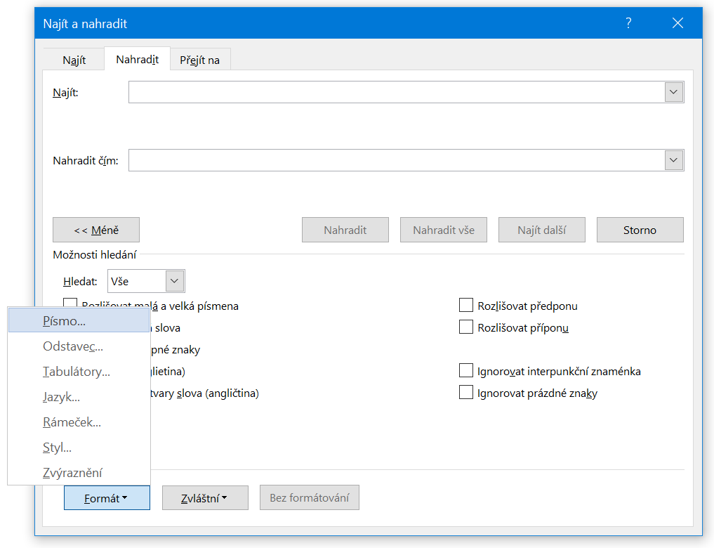 myši. Nájdeme teda možnosť Najít a nahradit (ďakujem
