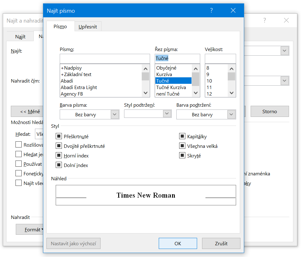 Ešte je potrebné pripomenúť, že nájsť aj nahradiť možno text okrem obsahu i podľa formátu - či je tučný alebo má nejaký iný konkrétny Štýl. K tomu slúži voľba Formát - Písmo / Štýl. Môžeme treba vyhľadávať len písmo písané tučne, zadanie takého nastavenia potom vyzerá nasledovne: