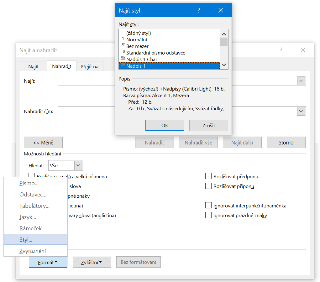 Alebo napríklad ak chceme nájsť všetky nadpisy štýlom Nadpis 1, postupujeme nasledovne: