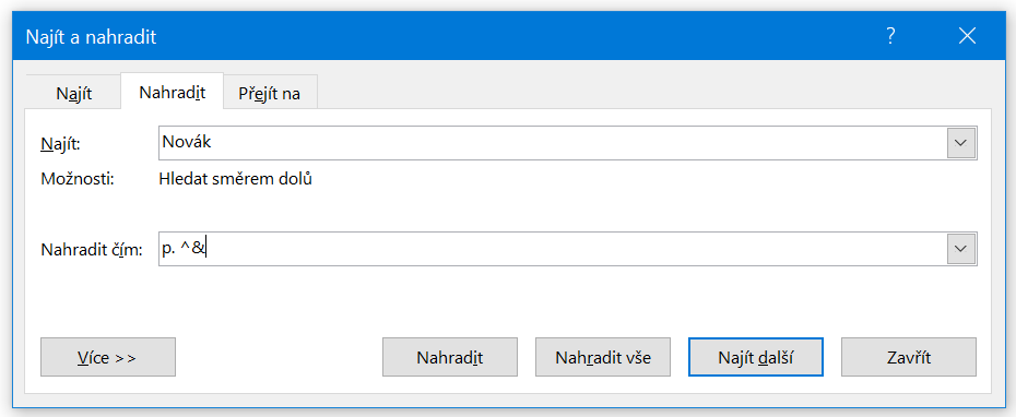 vyhľadáme meno "Novák" a jedným kliknutím z neho v texte urobíme