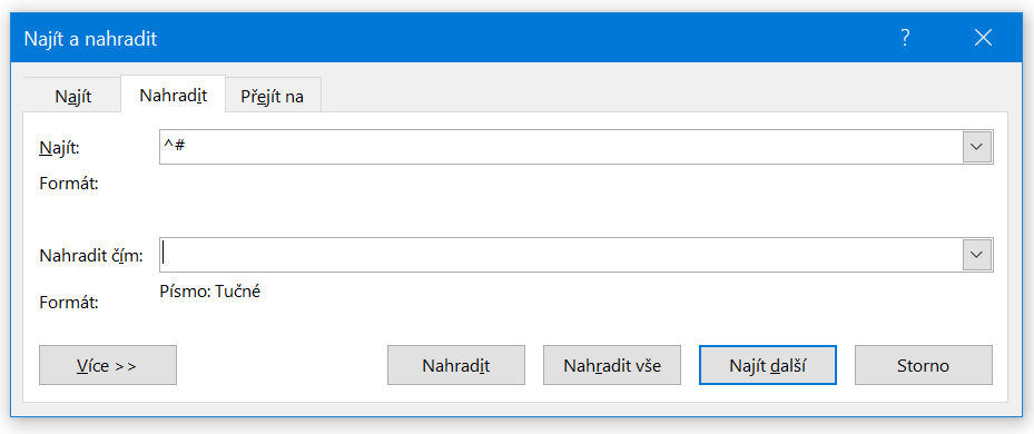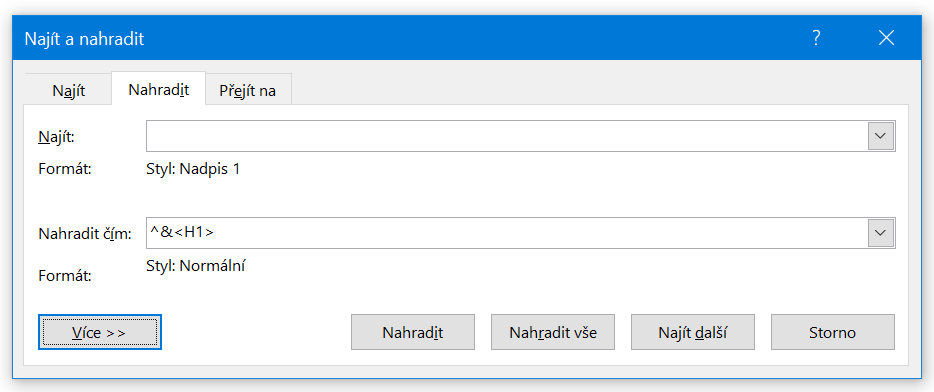 Nastavíme si vyhľadávanie na štýl Nadpis 1 a do nahradenia napíšeme potrebné znaky: