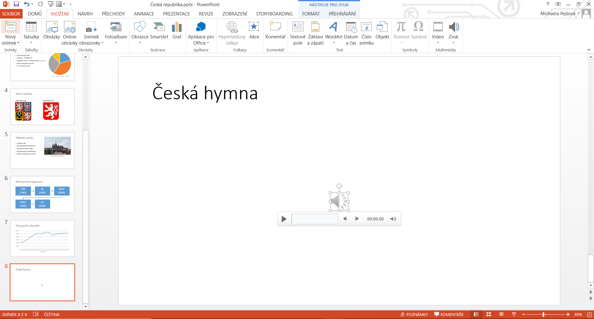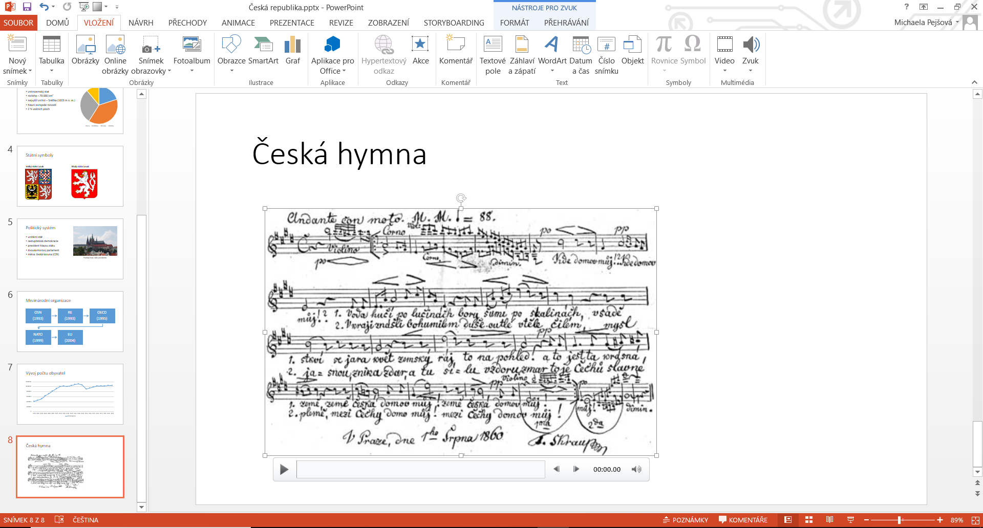 Ak by sme chceli publiku v priebehu prezentácie pustiť napríklad českú hymnu, môžeme do snímky vložiť aj zvuk. Tlačidlo na tento účel nájdeme znovu v záložke "Vloženie", tentoraz vpravo. Po vybraní zvuku zo súborov v počítači sa nám na snímke objavia malé tlačidlo; pokiaľ naň klikneme, spustí sa hudba.