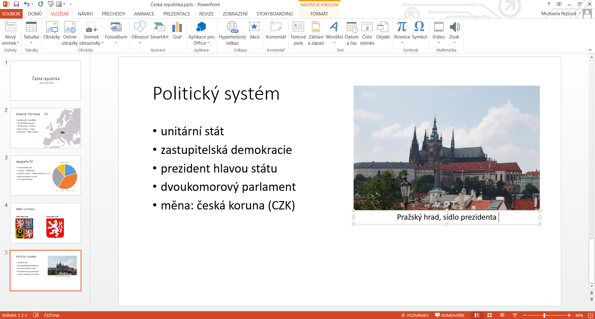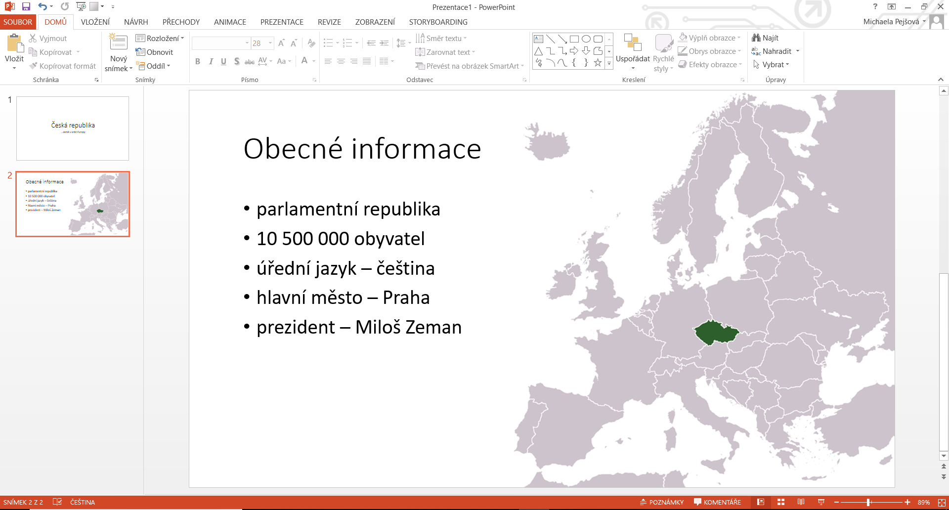 My tento snímok pojmeme ako základné informácie o Česku. Do poľa vložíme text písaný v zarážkach (nová zarážka vznikne stlačením klávesu Enter). Pridáme obrázok s polohou SR v rámci Európy (záložka "Vloženie" -> "Vložiť obrázok" v hornom menu).
