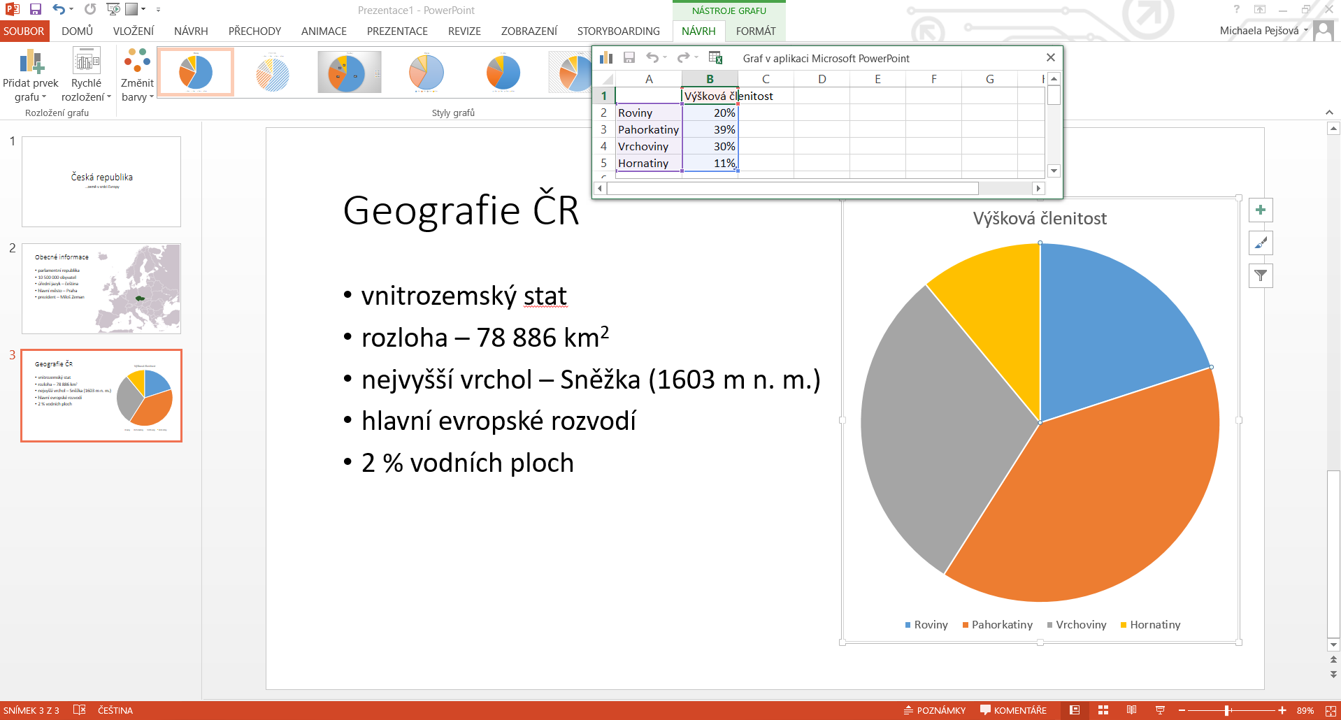 Nový snímok s názvom Geografia SR obohatíme grafom o výškové členitosti. Graf sa vkladá znova pomocou ikonky uprostred poľa s obsahom, alebo pomocou karty "Vloženie". Tu som vybrala koláčový graf, ktorý je pre tento účel najvhodnejší. Neskôr som ešte pridala graf iného typu pre znázornenie vývoja počtu obyvateľov. Grafom sa budeme venovať detailnejšie ďalej v kurze.