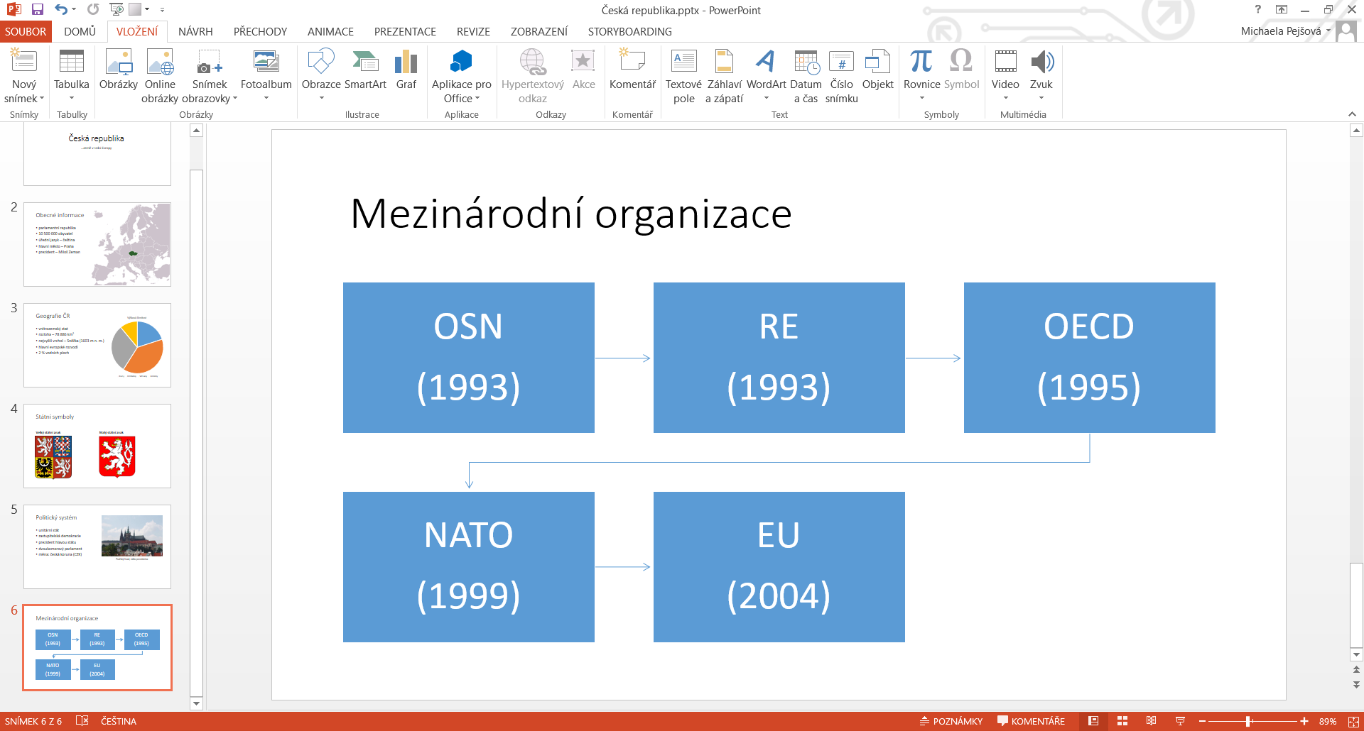 SmartArt je šikovný obrazec, vďaka ktorému môžeme vytvoriť prehľadné schémy a názorne tak odovzdať informáciu, ktorá by sa ústne v niektorých prípadoch odovzdávala len ťažko. My si vytvorenie jednoduchého SmartArt ukážeme tak, že sa pokúsime chronologicky znázorniť, ako SR postupne vstupovala do niektorých medzinárodných organizácií.