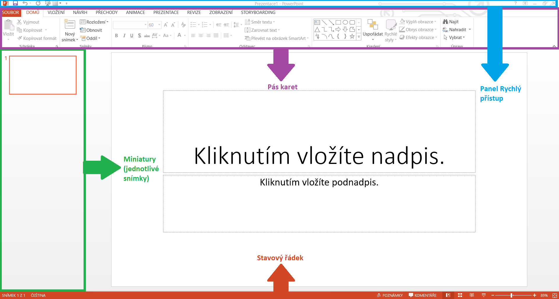 Po vytvorení novej prezentácie sa nám zobrazí základné prostredie s prvou snímkou: