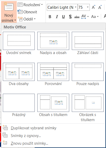 Kliknutím na tlačidlo "Nový snímok" sa pridá prednastavený druh snímky, teda "Nadpis a obsah". Ten býva používaný zďaleka najviac. Ak chceme pridať snímku s iným rozložením polí, vyvoláme ponuku rôznych rozlíšenie kliknutím na spodnú časť tlačidla "Nový snímok". Každé z preddefinovaných rozložení si samozrejme môžeme byť upravená vložením ďalších objektov (karta "Vložiť") alebo presunom či zmenou veľkosti tých existujúcich.