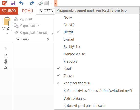 Na hornej lište nájdeme niekoľko ikon tzv. Rýchleho prístupu, napríklad "Uložiť", "Späť", a "Spustiť prezentáciu". Ak klikneme na šípku vpravo od týchto ikon, môžeme jednoducho nastaviť, ktoré ikony chceme zobrazovať a ktoré nie.