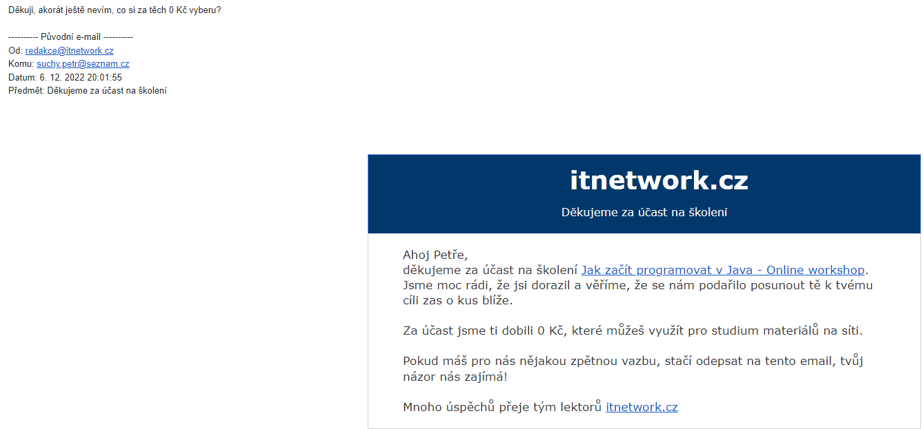 Automatický email s 0 kredity (Kč) za účast na Workshopu
