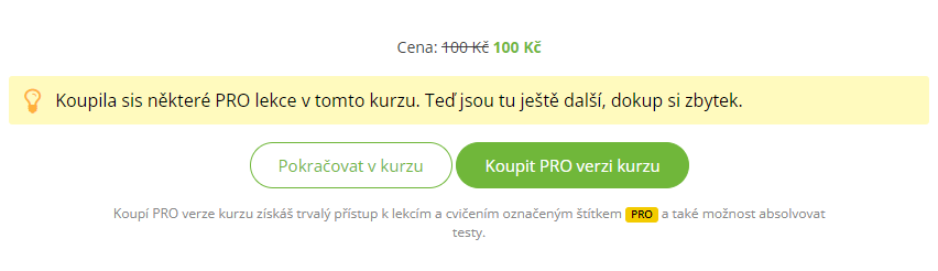 Po zakoupení balíčku e-learningového kurzu jsou další nově vydané PRO lekce za určitou cenu. Jsou uvedeny vedle sebe 2 identické. Jedna je přeškrtnutá (na obrázku 100 Kč) a vedle 'výhodnější' také 100 Kč.
