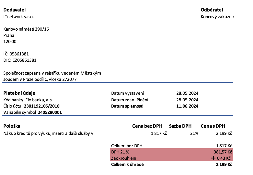 - v případě, že budeme (což chceme) chtít finální částku CELKEM K ÚHRADĚ zaokrouhlovat na celá čísla, musí zde být i řádek a informace o "Zaokrouhlení"
