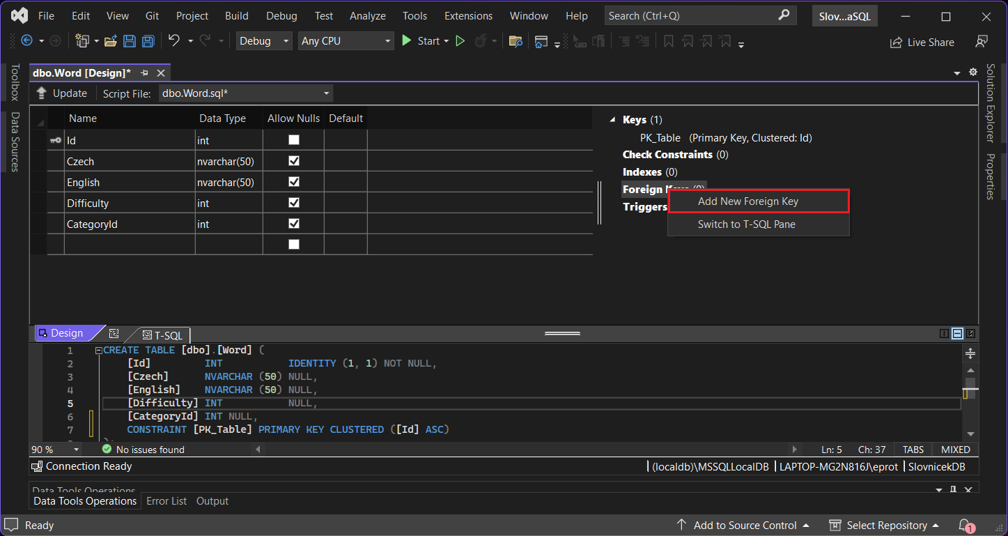 Foreign Keys, zvolíme Add New Foreign Key a pomenujme ho