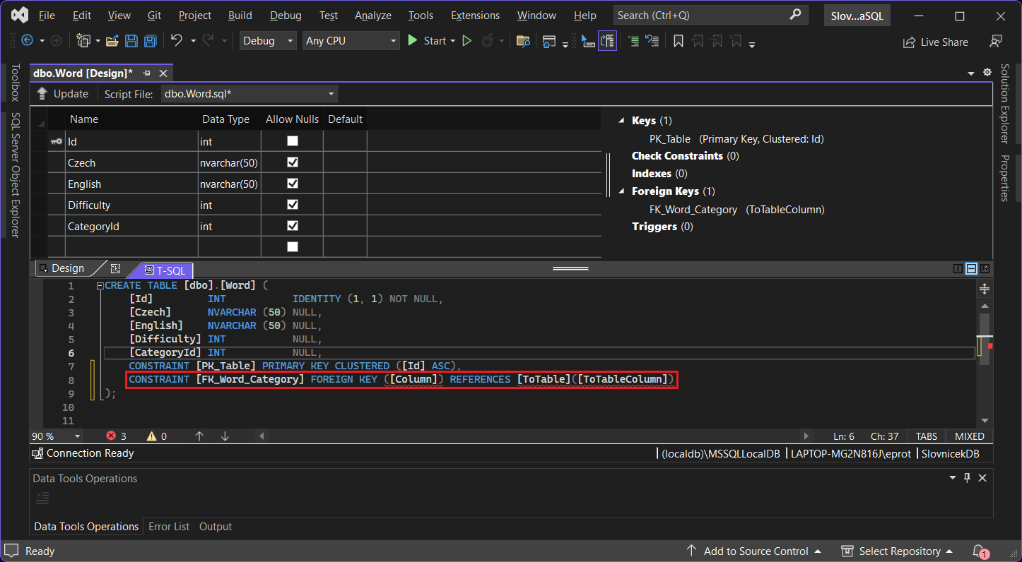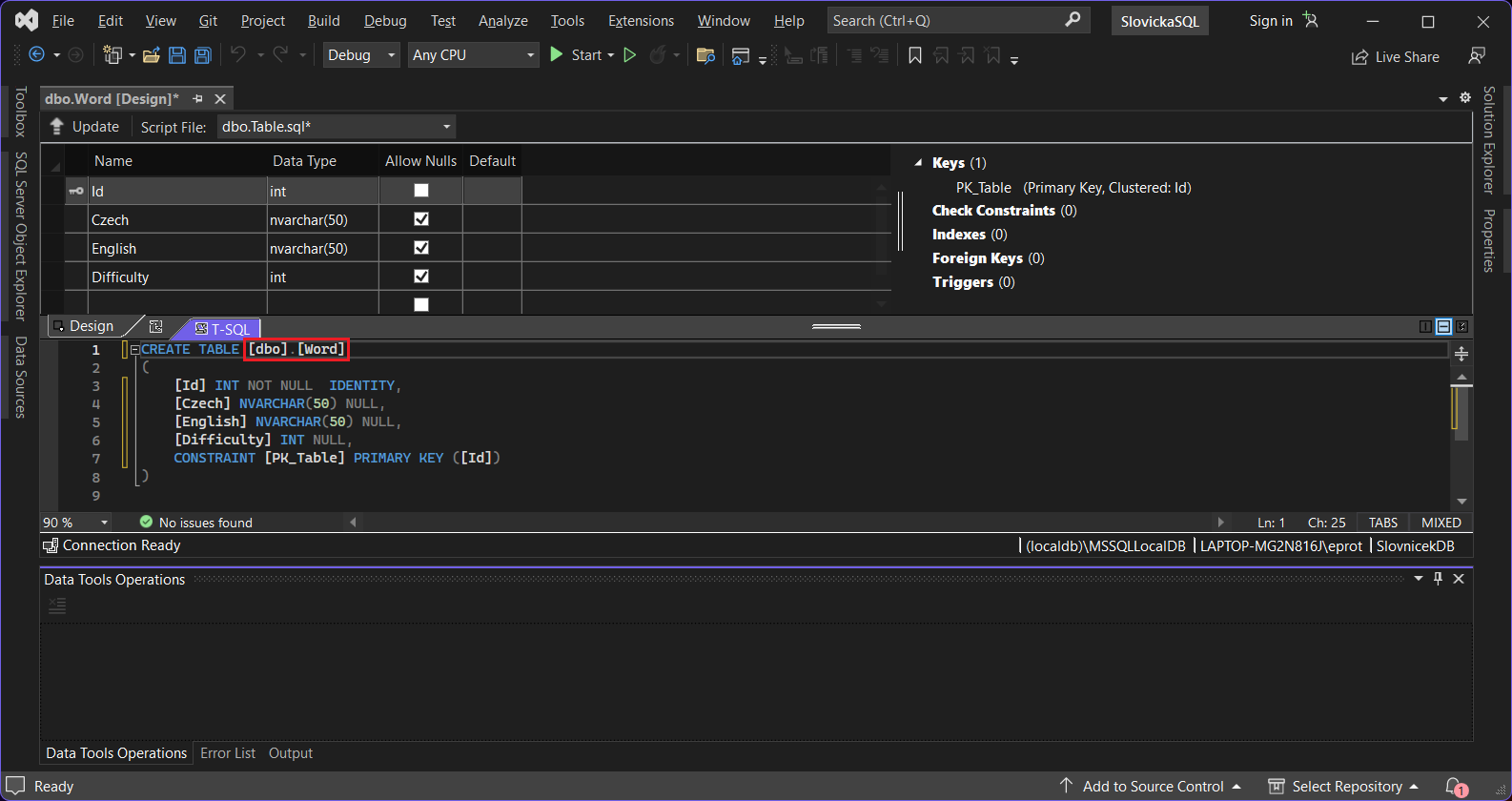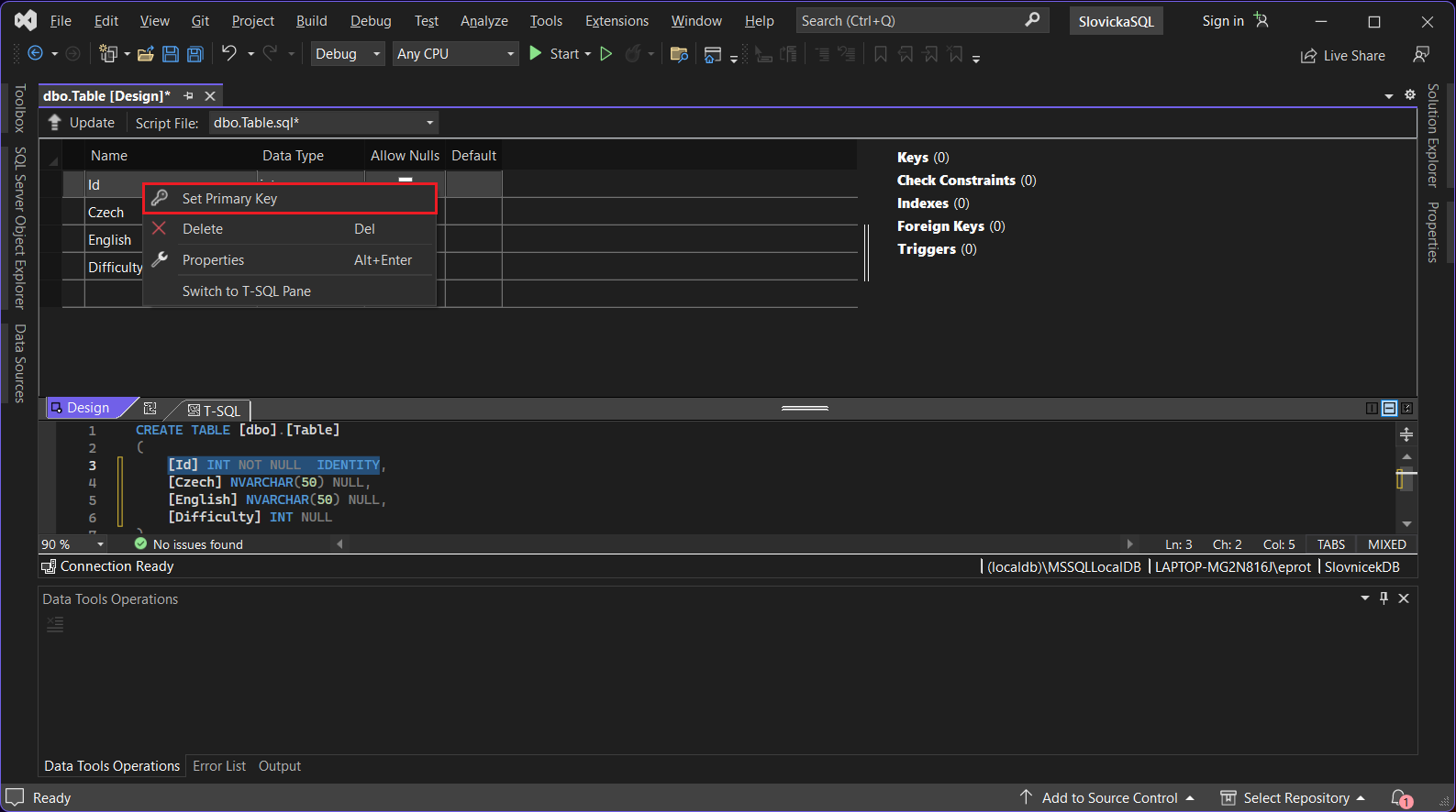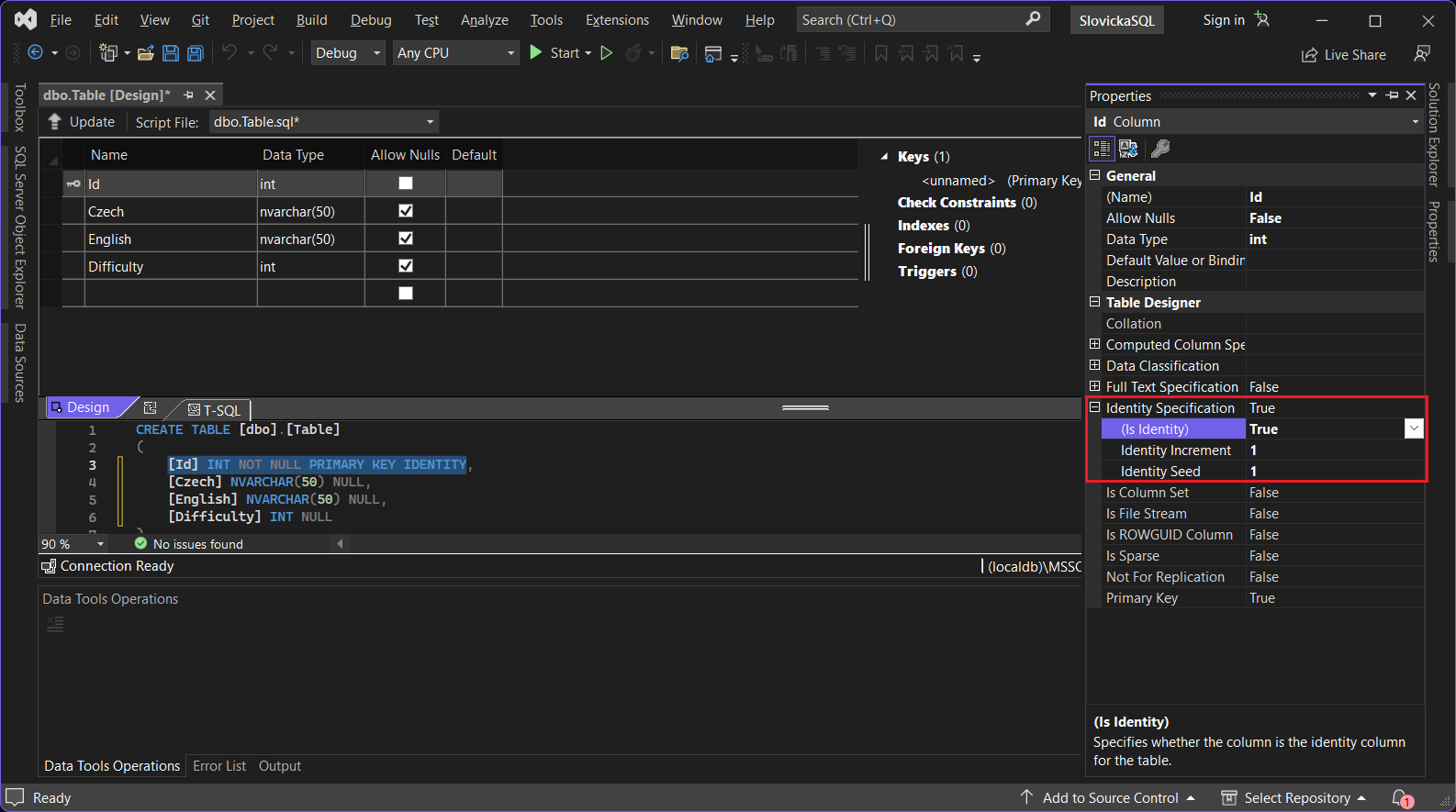 Visual Studio otvorí designer tabuľky. Tento designer má okno rozdelené na tri časti. V hornej polovici máme stĺpce našej tabuľky s ich dátovými typmi a ďalšími dôležitými vlastnosťami. Dole je výsledný T-SQL kód, ktorý sa spustí a databázu založí, až to budeme chcieť.