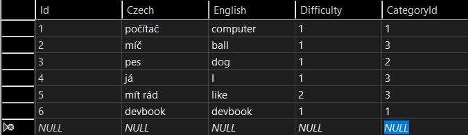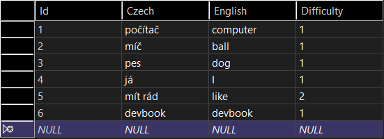 To znamená, že prvé slovíčko v tabuľke bude mať hodnotu Id